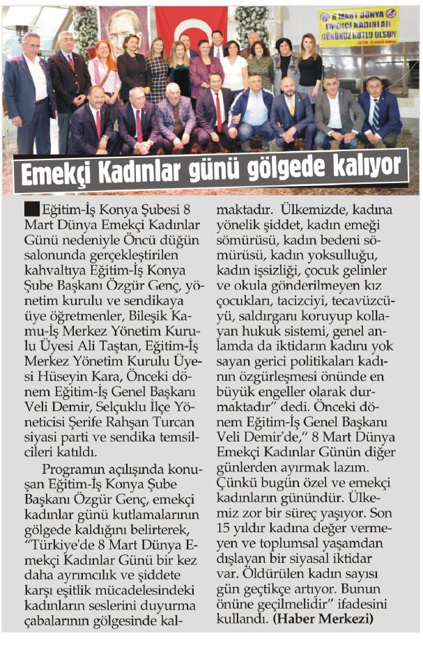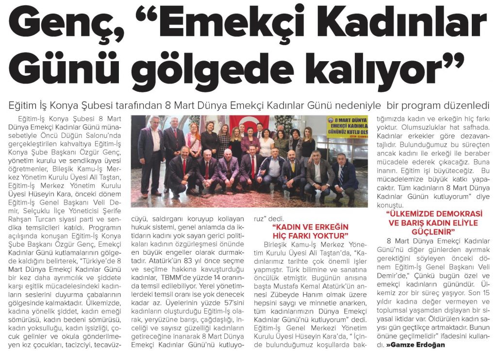 Programın açılışında konuşan Eğitim-İş Konya Şube Başkanı Özgür Genç, emekçi kadınlar günü kutlamalarının gölgede kaldığını belirterek, “Türkiye’de 8 Mart Dünya Emekçi Kadınlar Günü bir kez daha ayrımcılık ve şiddete karşı eşitlik mücadelesindeki kadınların seslerini duyurma çabalarının gölgesinde kalmaktadır. Ülkemizde, kadına yönelik şiddet, kadın emeği sömürüsü, kadın bedeni sömürüsü, kadın yoksulluğu, kadın işsizliği, çocuk gelinler ve okula gönderilmeyen kız çocukları, tacizciyi, tecavüzcüyü, saldırganı koruyup kollayan hukuk sistemi, genel anlamda da iktidarın kadını yok sayan gerici politikaları kadının özgürleşmesi önünde en büyük engeller olarak durmaktadır. Kadına yönelik şiddet ve kadın cinayetleri her geçen gün artarak yükselmektedir. Türkiye’de 18 yaş altındaki evlilik oranı (TÜİK 2016) yüzde 17,9, Bu oran 2006 yılında yüzde 20 iken 2011 yılında yüzde 18 olarak gerçekleşmiş. Erken yaşta evlilik oranlarında Dünya’dan diğer örnekler arasında UNICEF’e göre Pakistan’ın ve Fas’ın önünde, Filistin ile ise aynı durumdayız. Atatürk’ün 83 yıl önce seçme ve seçilme hakkına kavuşturduğu kadınlar, TBMM’de yüzde 14 oranında temsil edilebiliyor. Yerel yönetimlerdeki temsil oranı ise yok denecek kadar az. Üyelerinin yüzde 57’sini kadınların oluşturduğu Eğitim-İş olarak, yeryüzüne barışı, çağdaşlığı, inceliği ve sayısız güzelliği kadınların getireceğine inanarak 8 Mart Dünya Emekçi Kadınlar Günü’nü kutluyoruz” dedi.