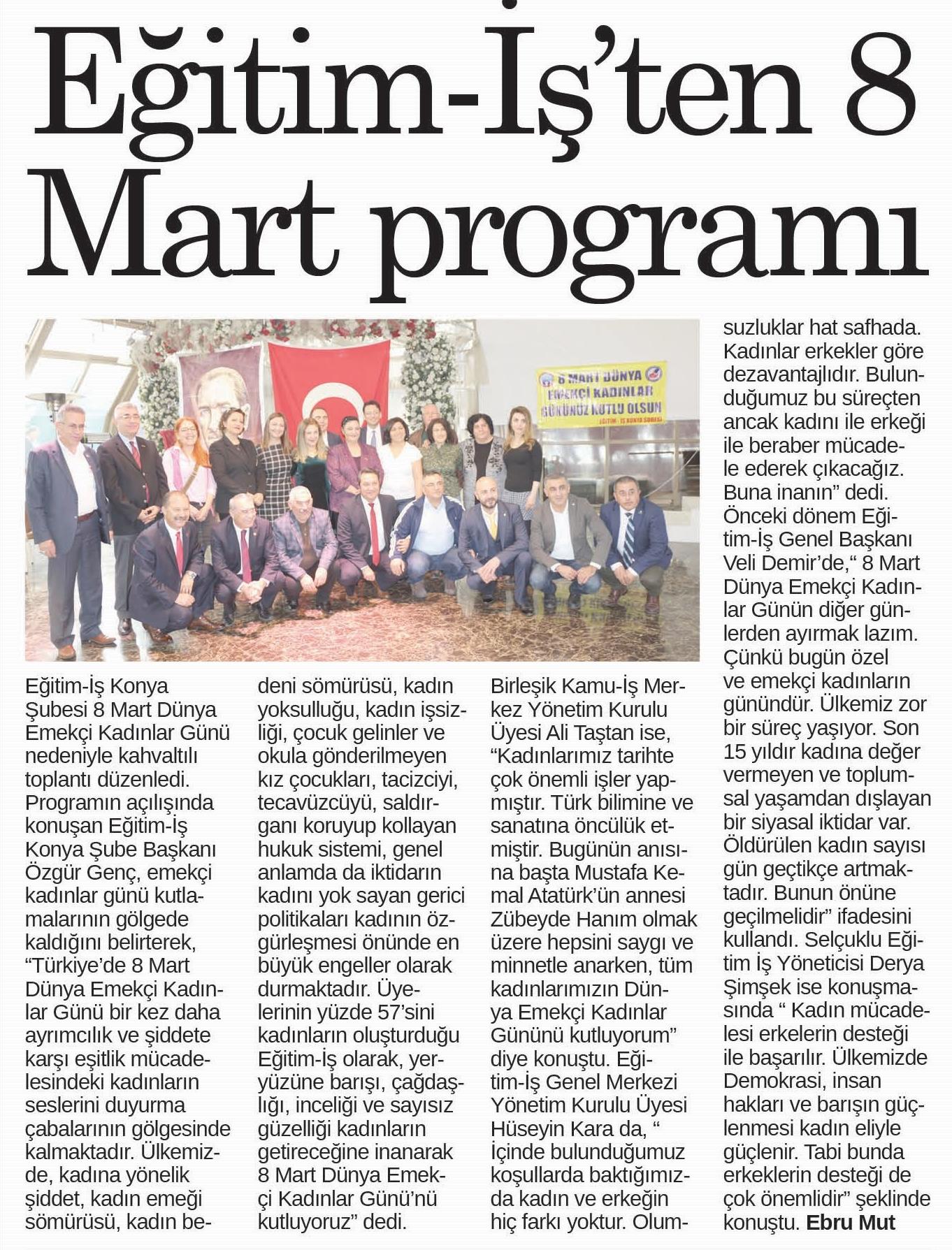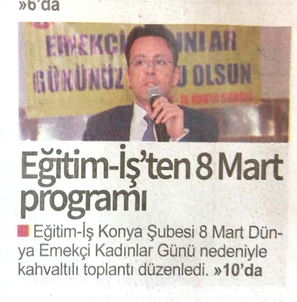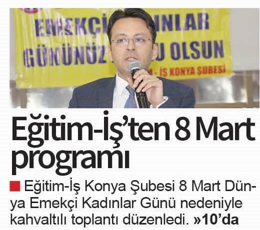 Eğitim-İş Konya Şubesi olarak 8 Mart Dünya Emekçi Kadınlar Günü nedeniyle Öncü düğün salonunda gerçekleştirilen kahvaltıya Eğitim-İş Konya Şube Başkanı Özgür Genç, yönetim kurulu ve sendikaya üye öğretmenler, Bileşik Kamu-İş Genel Merkez Yönetim Kurulu Üyesi Ali Taştan, Eğitim-İş Genel Merkez Yönetim Kurulu Üyesi Hüseyin Kara, Önceki dönem Eğitim-İş Genel Başkanı Veli Demir, Selçuklu İlçe Yöneticisi Şerife Rahşan Turcan siyasi parti ve sendika temsilcileri katıldı.